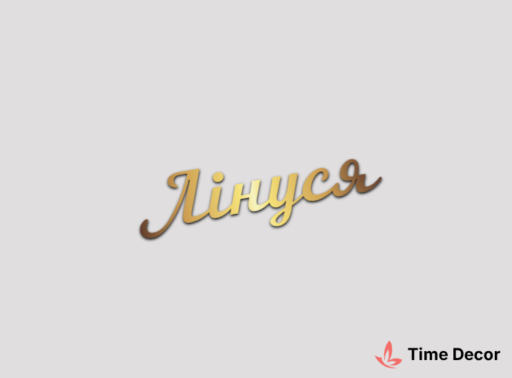 Пластиковий напис "Лінуся" – дзеркальний або матовий пластик, можливе виготовлення з клейкою зворотною поверхнею для легкого монтажу.