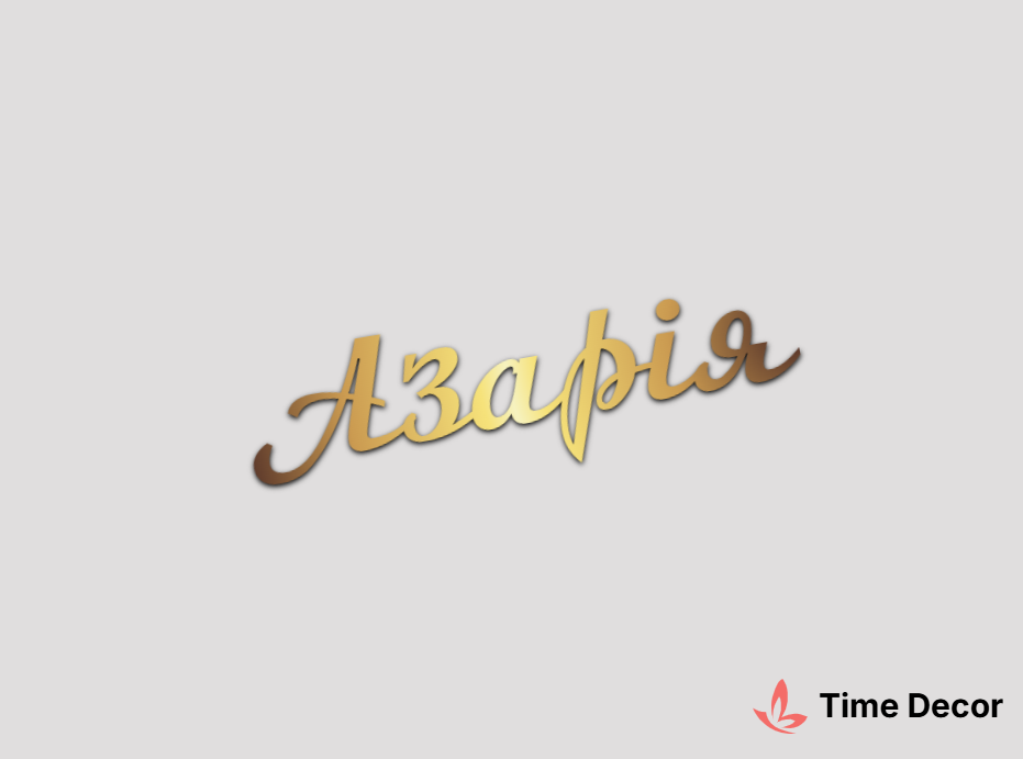 Пластиковий напис "Азарія" – дзеркальний або матовий пластик, можливе виготовлення з клейкою зворотною поверхнею для легкого монтажу.