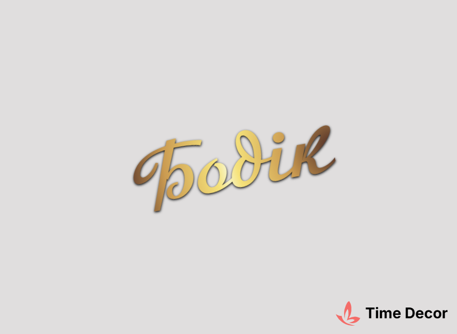 Пластиковий напис "Бодік" – дзеркальний або матовий пластик, можливе виготовлення з клейкою зворотною поверхнею для легкого монтажу.