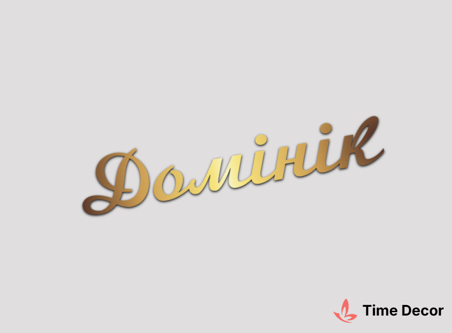 Пластиковий напис "Домінік" – дзеркальний або матовий пластик, можливе виготовлення з клейкою зворотною поверхнею для легкого монтажу.