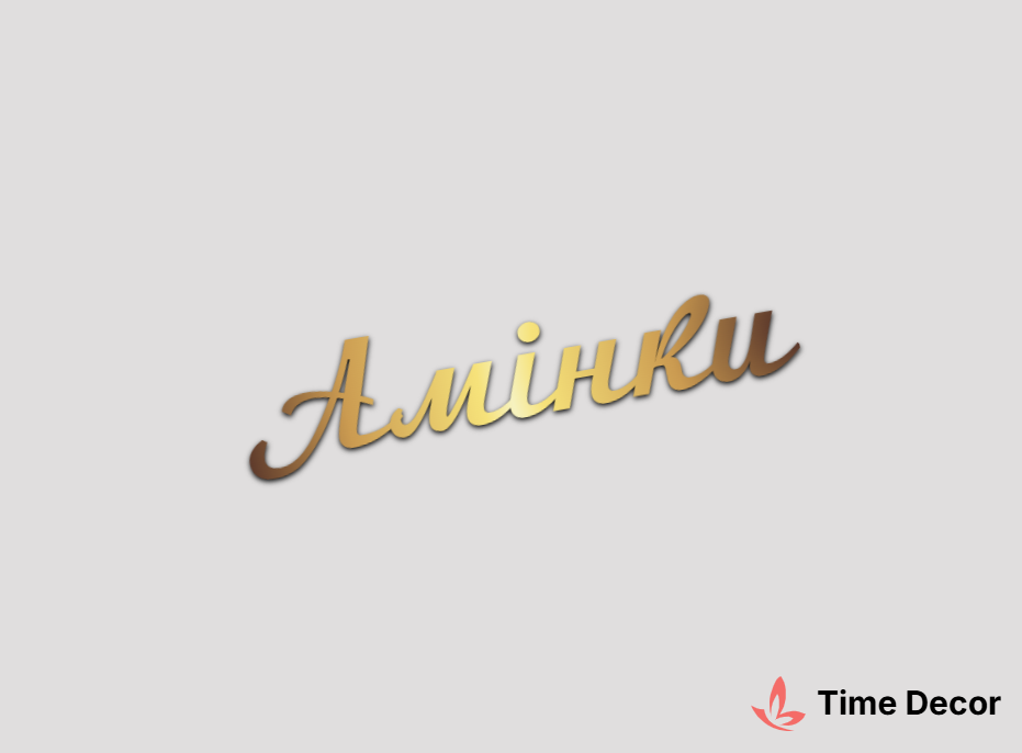 Пластиковий напис "Амінки" – дзеркальний або матовий пластик, можливе виготовлення з клейкою зворотною поверхнею для легкого монтажу.