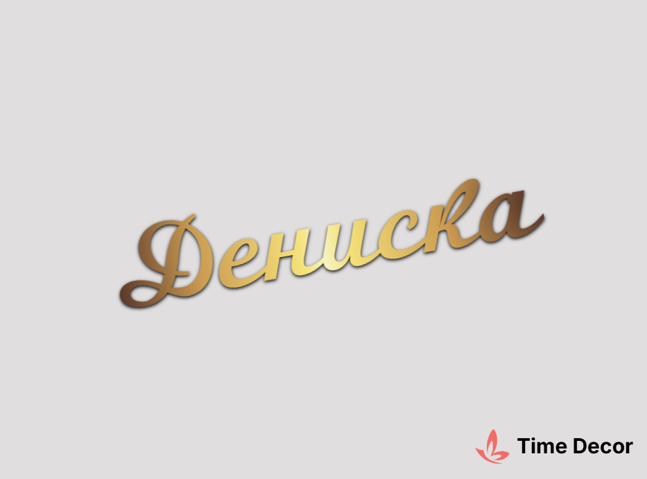 Пластиковий напис "Дениска" – дзеркальний або матовий пластик, можливе виготовлення з клейкою зворотною поверхнею для легкого монтажу.