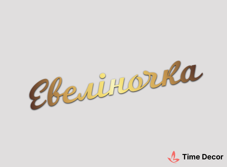 Пластиковий напис "Евеліночка" – дзеркальний або матовий пластик, можливе виготовлення з клейкою зворотною поверхнею для легкого монтажу.