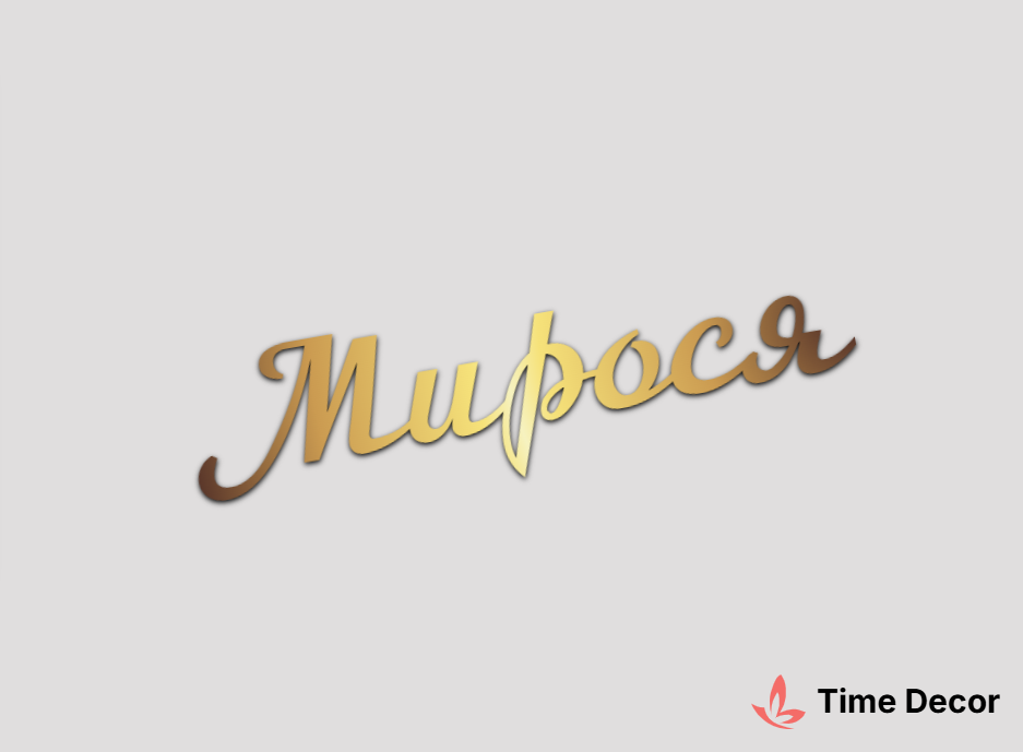 Пластиковий напис "Мирося" – дзеркальний або матовий пластик, можливе виготовлення з клейкою зворотною поверхнею для легкого монтажу.