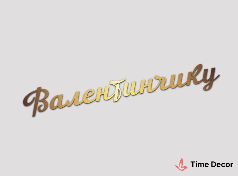 Пластиковий напис "Валентинчику" – дзеркальний або матовий пластик, можливе виготовлення з клейкою зворотною поверхнею для легкого монтажу.