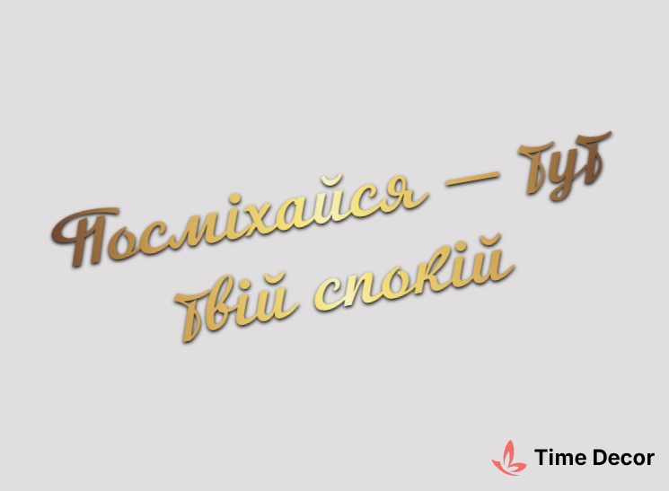 Пластиковий напис "Посміхайся — тут твій спокій" – дзеркальний або матовий пластик, можливе виготовлення з клейкою зворотною поверхнею для легкого монтажу.
