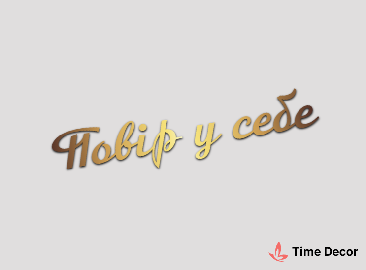 Пластиковий напис "Повір у себе" – дзеркальний або матовий пластик, можливе виготовлення з клейкою зворотною поверхнею для легкого монтажу.