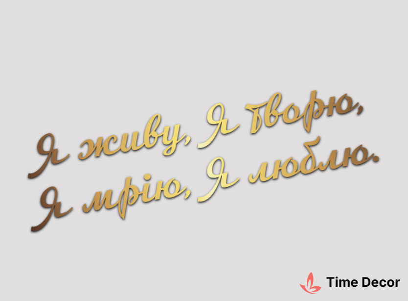 Пластиковий напис "Я живу, Я творю, Я мрію, Я люблю." – дзеркальний або матовий пластик, можливе виготовлення з клейкою зворотною поверхнею для легкого монтажу.