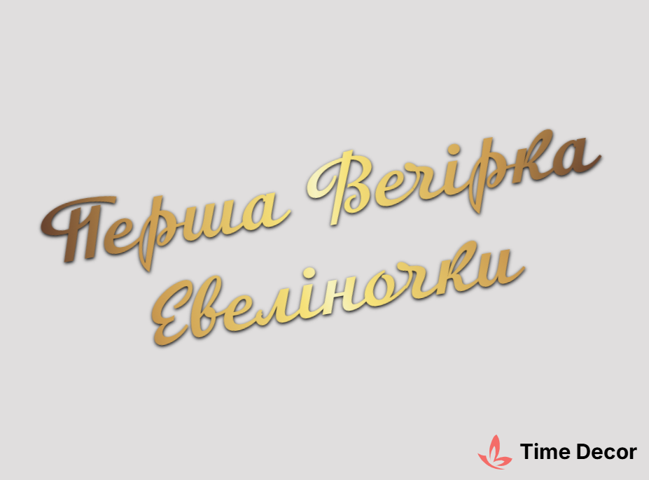 Пластиковий напис "Перша Вечірка Евеліночки" – дзеркальний або матовий пластик, можливе виготовлення з клейкою зворотною поверхнею для легкого монтажу.