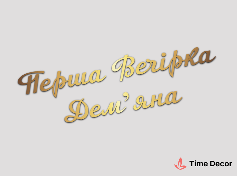 Пластиковий напис "Перша Вечірка Демʼяна" – дзеркальний або матовий пластик, можливе виготовлення з клейкою зворотною поверхнею для легкого монтажу.