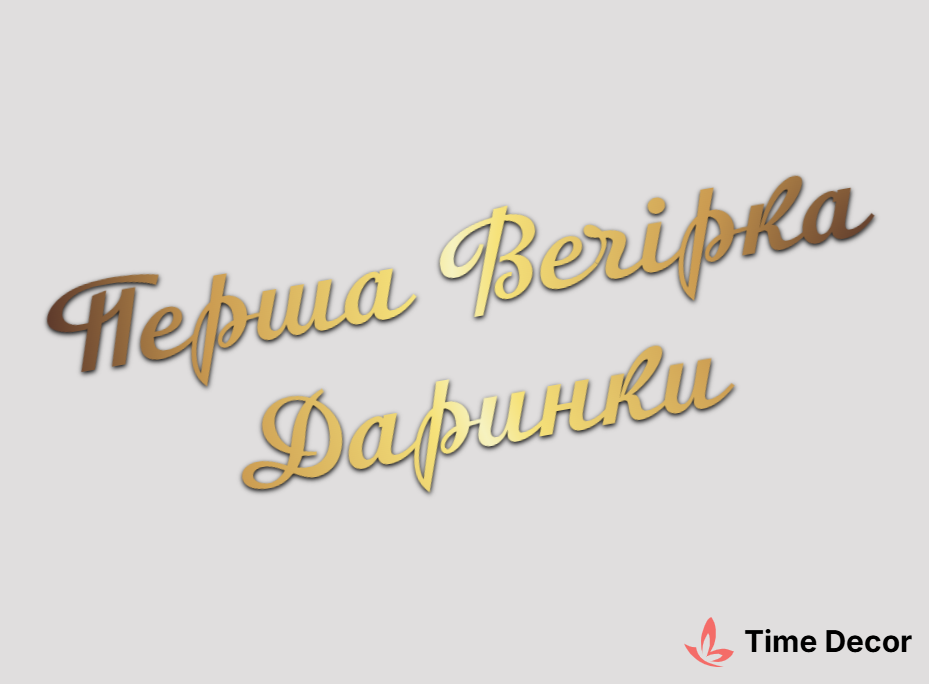 Пластиковий напис "Перша Вечірка Даринки" – дзеркальний або матовий пластик, можливе виготовлення з клейкою зворотною поверхнею для легкого монтажу.
