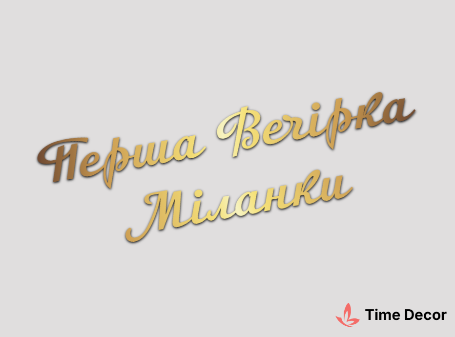 Пластиковий напис "Перша Вечірка Міланки" – дзеркальний або матовий пластик, можливе виготовлення з клейкою зворотною поверхнею для легкого монтажу.
