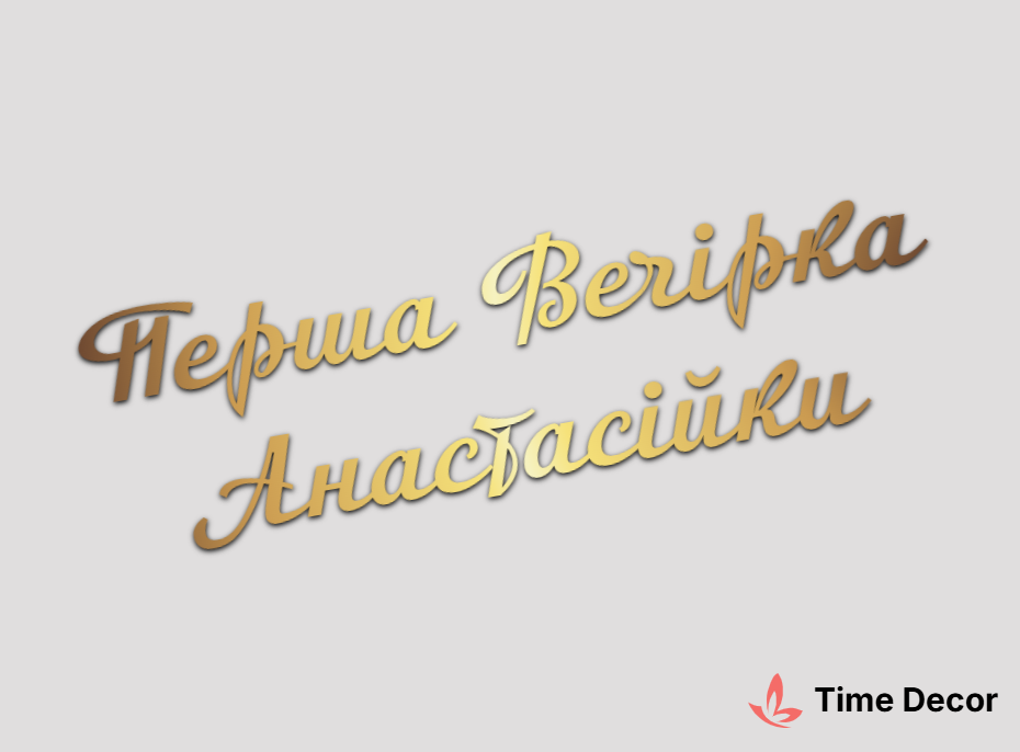 Пластиковий напис "Перша Вечірка Анастасійки" – дзеркальний або матовий пластик, можливе виготовлення з клейкою зворотною поверхнею для легкого монтажу.
