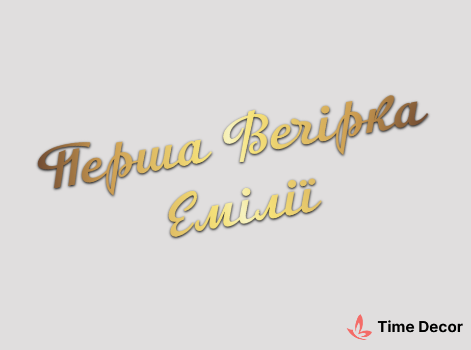 Пластиковий напис "Перша Вечірка Емілії" – дзеркальний або матовий пластик, можливе виготовлення з клейкою зворотною поверхнею для легкого монтажу.