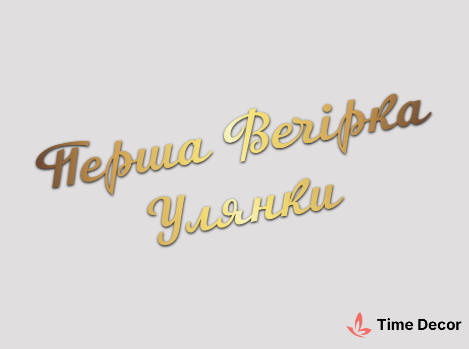 Пластиковий напис "Перша Вечірка Улянки" – дзеркальний або матовий пластик, можливе виготовлення з клейкою зворотною поверхнею для легкого монтажу.