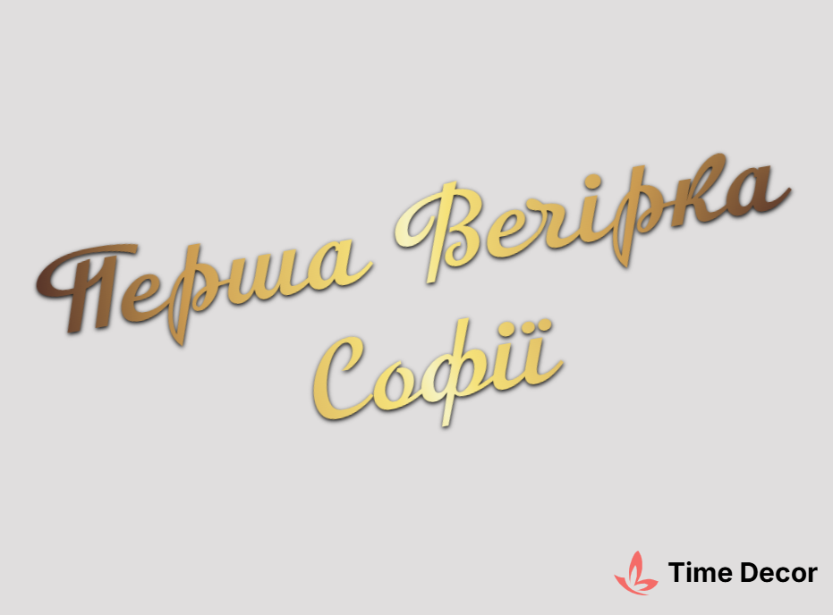 Пластиковий напис "Перша Вечірка Софії" – дзеркальний або матовий пластик, можливе виготовлення з клейкою зворотною поверхнею для легкого монтажу.