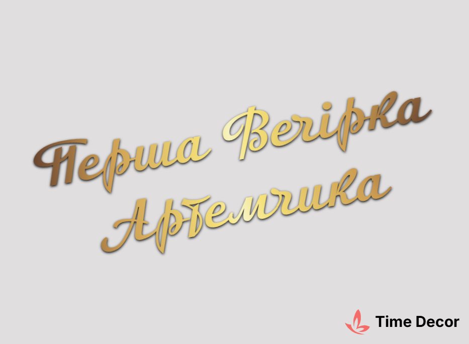 Пластиковий напис "Перша Вечірка Артемчика" – дзеркальний або матовий пластик, можливе виготовлення з клейкою зворотною поверхнею для легкого монтажу.