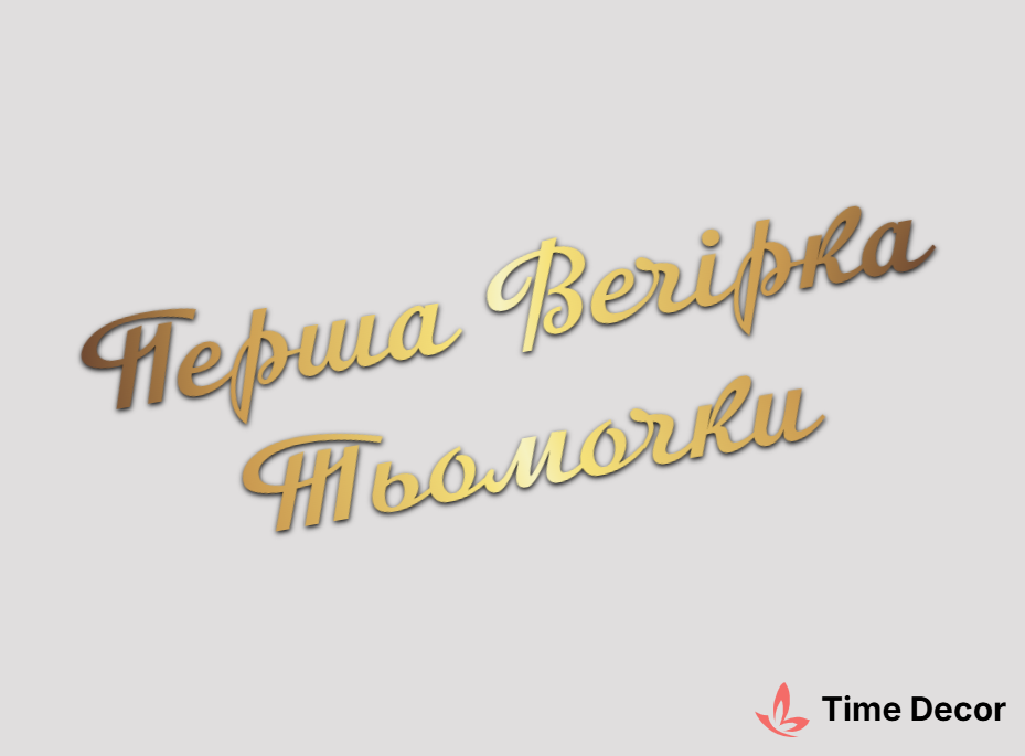 Пластиковий напис "Перша Вечірка Тьомочки" – дзеркальний або матовий пластик, можливе виготовлення з клейкою зворотною поверхнею для легкого монтажу.