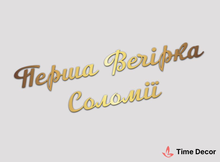 Пластиковий напис "Перша Вечірка Соломії" – дзеркальний або матовий пластик, можливе виготовлення з клейкою зворотною поверхнею для легкого монтажу.