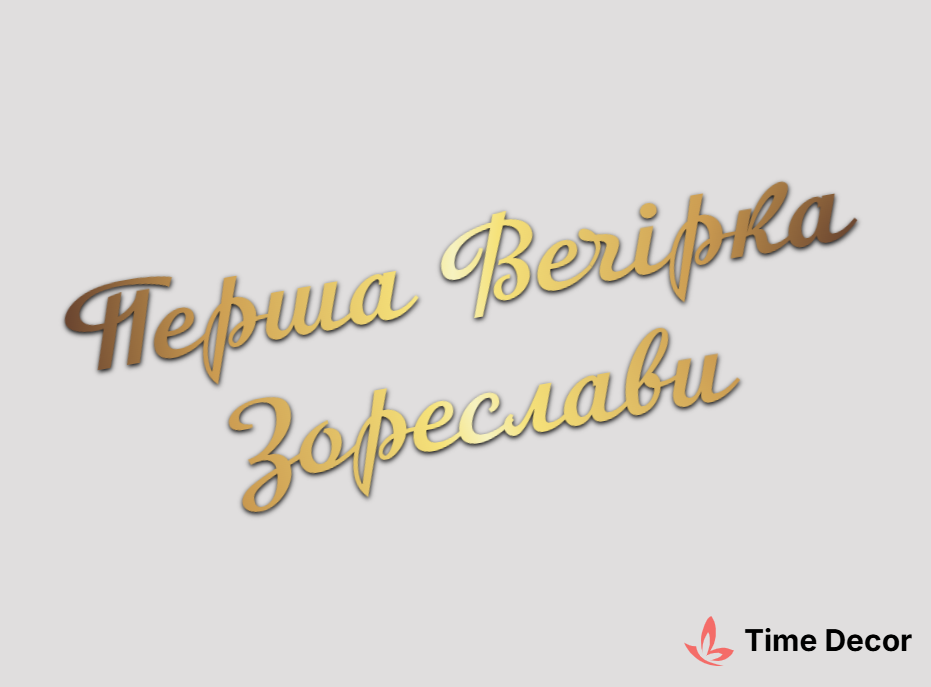 Пластиковий напис "Перша Вечірка Зореслави" – дзеркальний або матовий пластик, можливе виготовлення з клейкою зворотною поверхнею для легкого монтажу.