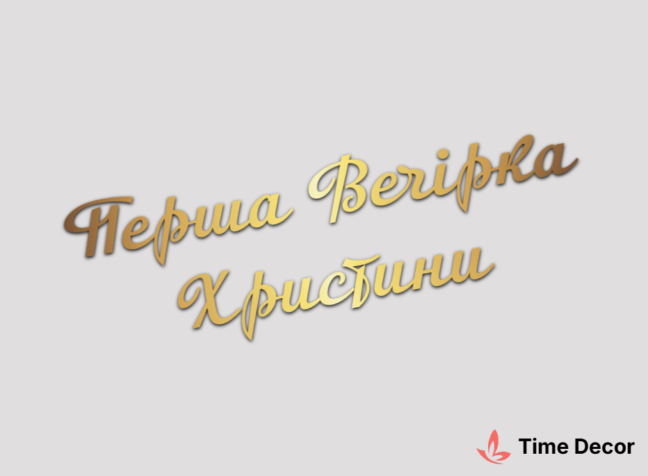 Пластиковий напис "Перша Вечірка Христини" – дзеркальний або матовий пластик, можливе виготовлення з клейкою зворотною поверхнею для легкого монтажу.
