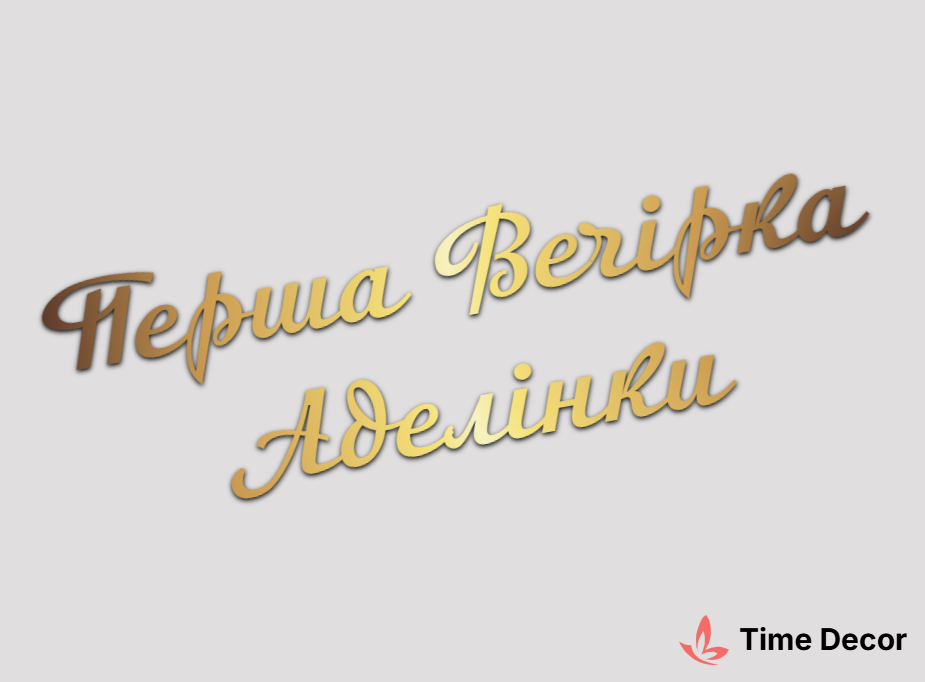 Пластиковий напис "Перша Вечірка Аделінки" – дзеркальний або матовий пластик, можливе виготовлення з клейкою зворотною поверхнею для легкого монтажу.