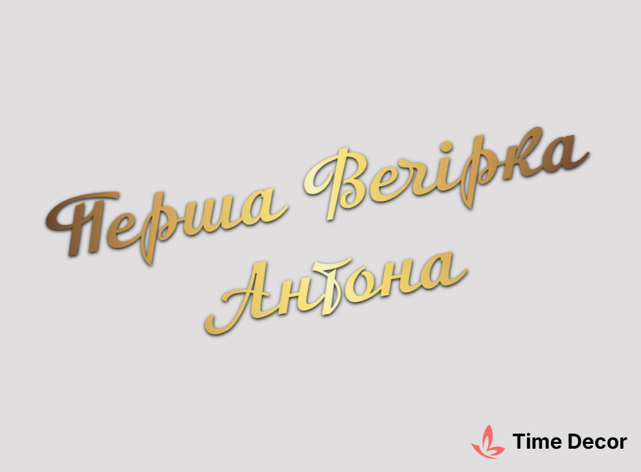 Пластиковий напис "Перша Вечірка Антона" – дзеркальний або матовий пластик, можливе виготовлення з клейкою зворотною поверхнею для легкого монтажу.