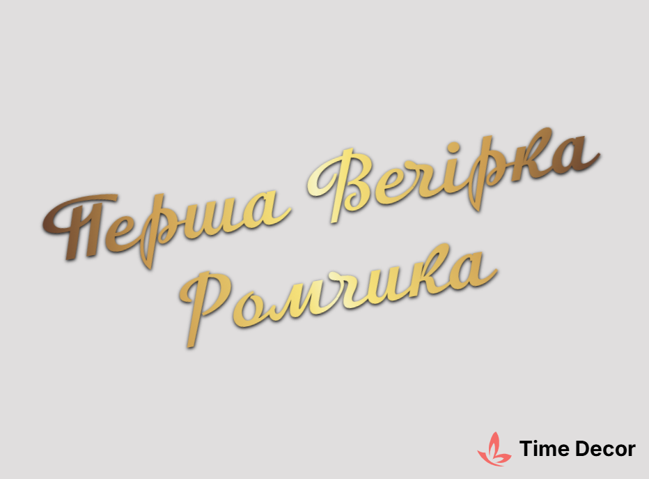 Пластиковий напис "Перша Вечірка Ромчика" – дзеркальний або матовий пластик, можливе виготовлення з клейкою зворотною поверхнею для легкого монтажу.