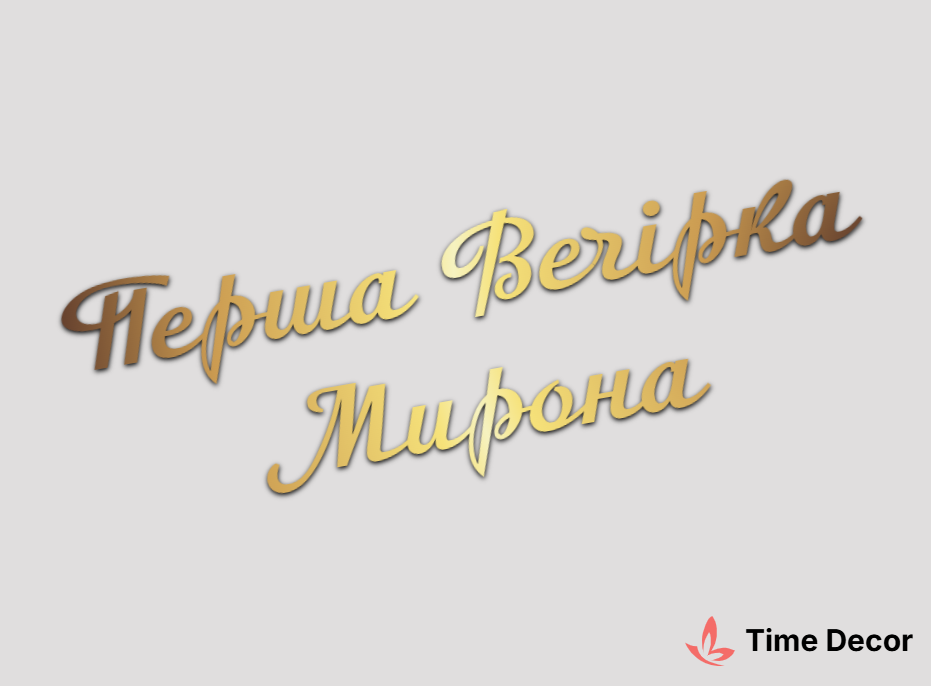 Пластиковий напис "Перша Вечірка Мирона" – дзеркальний або матовий пластик, можливе виготовлення з клейкою зворотною поверхнею для легкого монтажу.