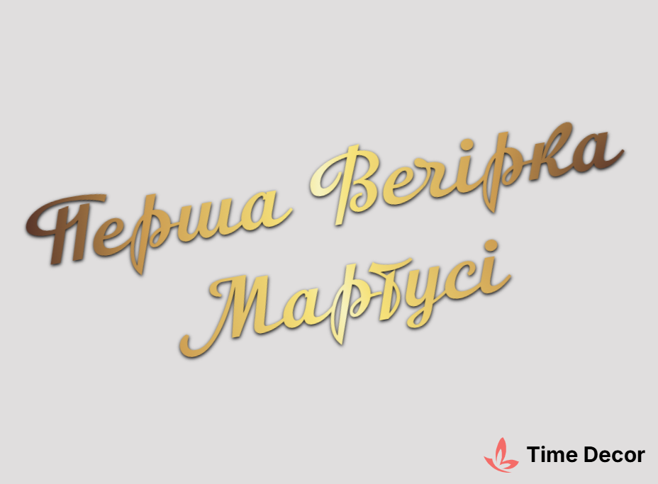 Пластиковий напис "Перша Вечірка Мартусі" – дзеркальний або матовий пластик, можливе виготовлення з клейкою зворотною поверхнею для легкого монтажу.