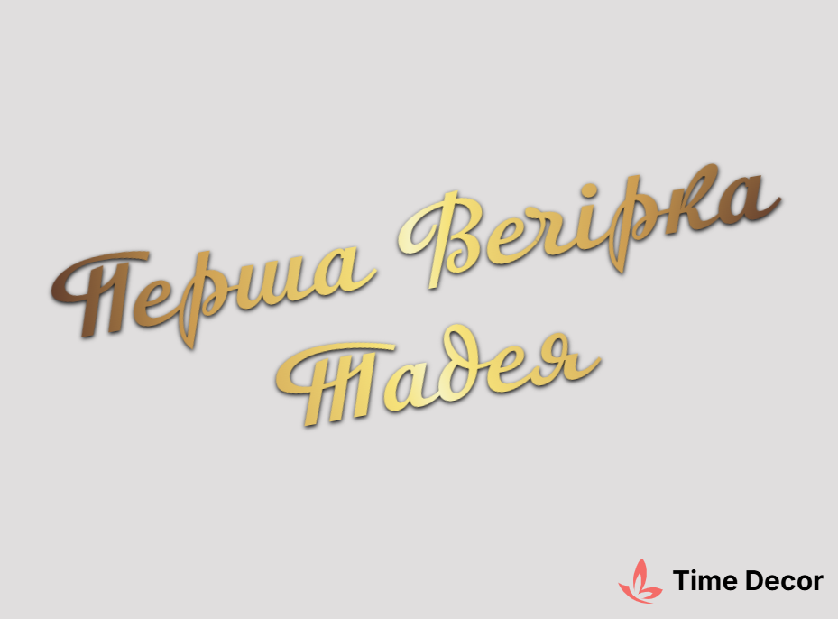 Пластиковий напис "Перша Вечірка Тадея" – дзеркальний або матовий пластик, можливе виготовлення з клейкою зворотною поверхнею для легкого монтажу.