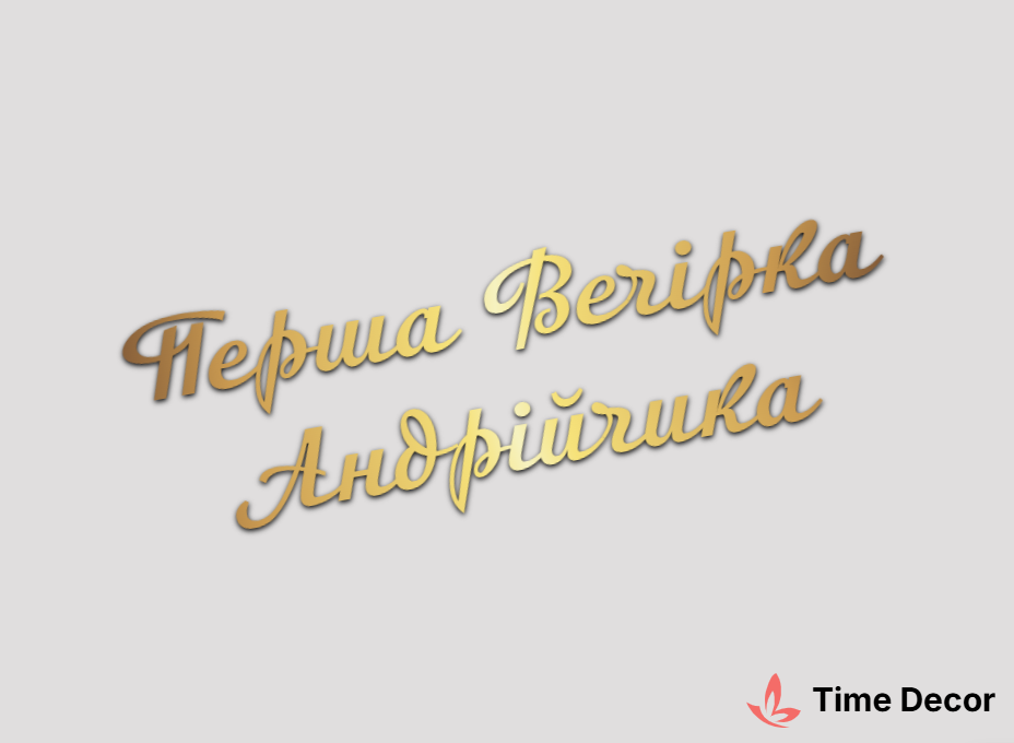 Пластиковий напис "Перша Вечірка Андрійчика" – дзеркальний або матовий пластик, можливе виготовлення з клейкою зворотною поверхнею для легкого монтажу.