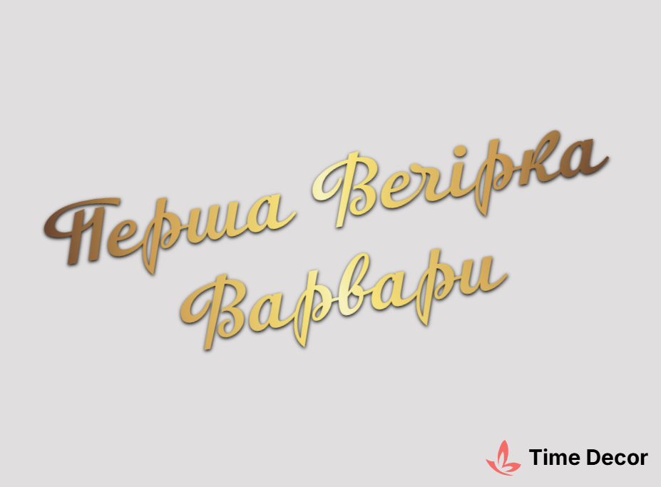 Пластиковий напис "Перша Вечірка Варвари" – дзеркальний або матовий пластик, можливе виготовлення з клейкою зворотною поверхнею для легкого монтажу.