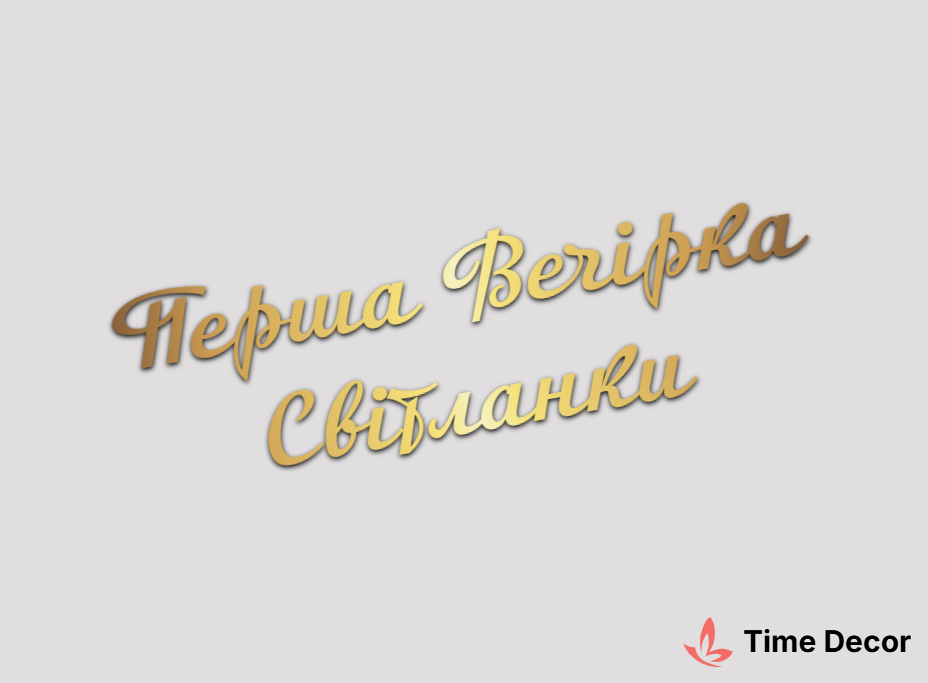 Пластиковий напис "Перша Вечірка Світланки" – дзеркальний або матовий пластик, можливе виготовлення з клейкою зворотною поверхнею для легкого монтажу.