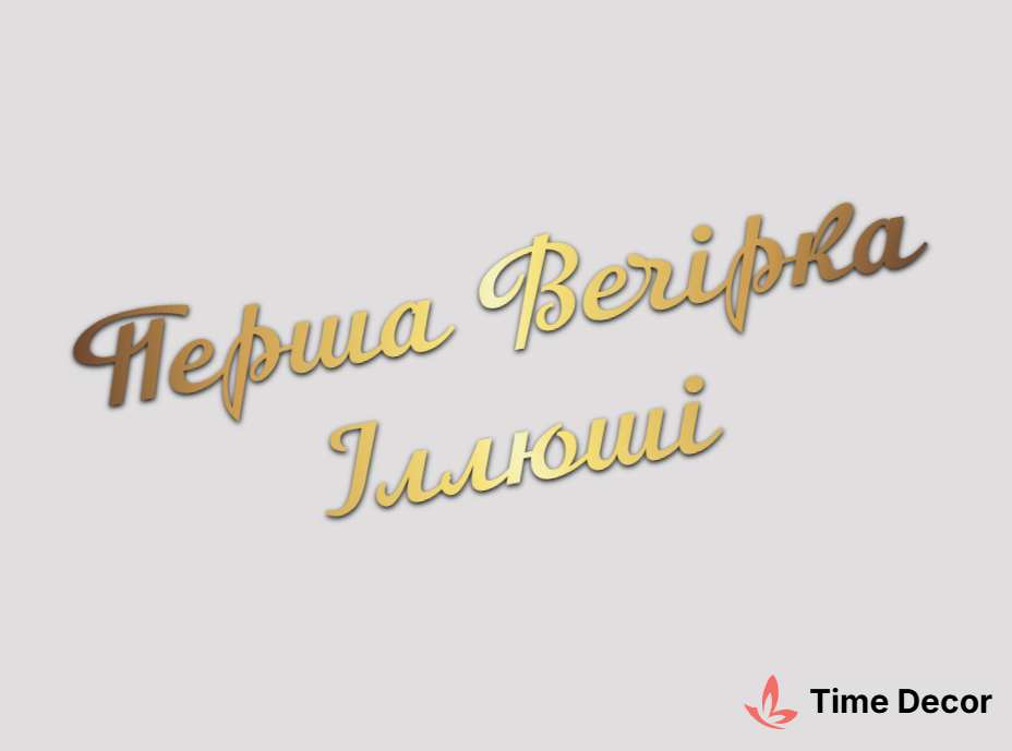 Пластиковий напис "Перша Вечірка Іллюші" – дзеркальний або матовий пластик, можливе виготовлення з клейкою зворотною поверхнею для легкого монтажу.