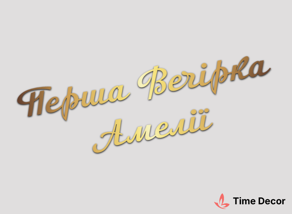 Пластиковий напис "Перша Вечірка Амелії" – дзеркальний або матовий пластик, можливе виготовлення з клейкою зворотною поверхнею для легкого монтажу.