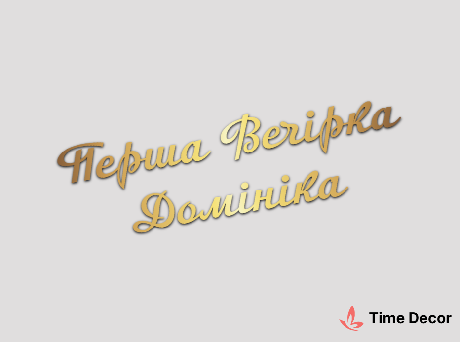 Пластиковий напис "Перша Вечірка Домініка" – дзеркальний або матовий пластик, можливе виготовлення з клейкою зворотною поверхнею для легкого монтажу.