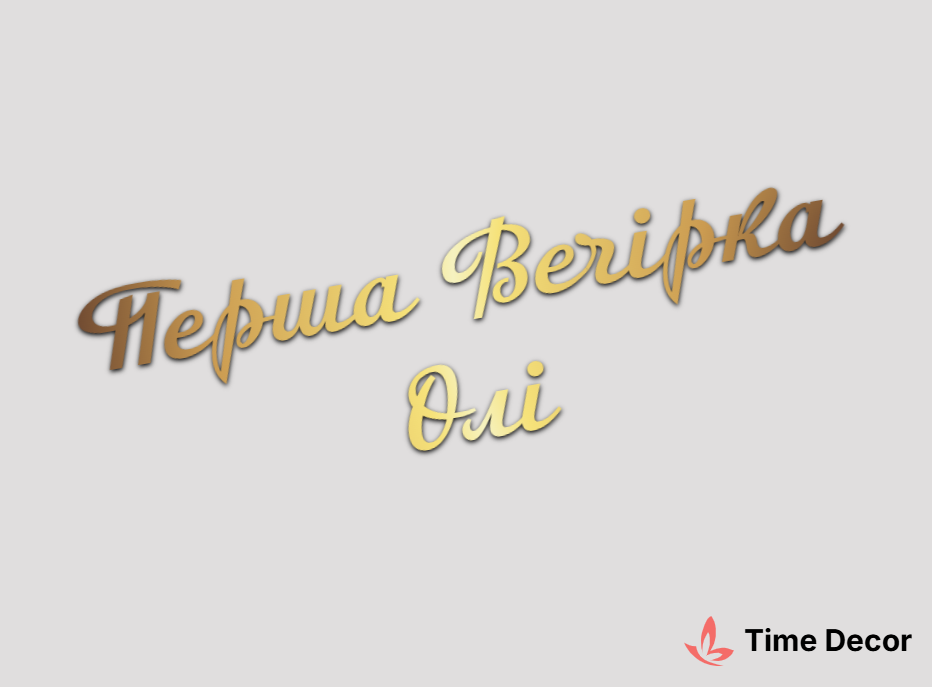 Пластиковий напис "Перша Вечірка Олі" – дзеркальний або матовий пластик, можливе виготовлення з клейкою зворотною поверхнею для легкого монтажу.