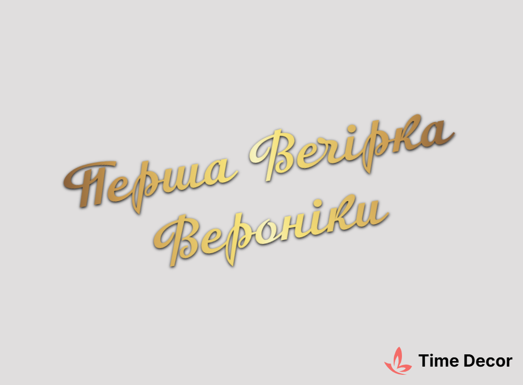 Пластиковий напис "Перша Вечірка Вероніки" – дзеркальний або матовий пластик, можливе виготовлення з клейкою зворотною поверхнею для легкого монтажу.