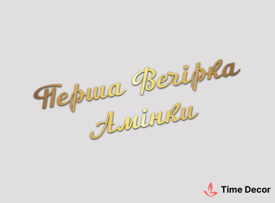 Пластиковий напис "Перша Вечірка Амінки" – дзеркальний або матовий пластик, можливе виготовлення з клейкою зворотною поверхнею для легкого монтажу.