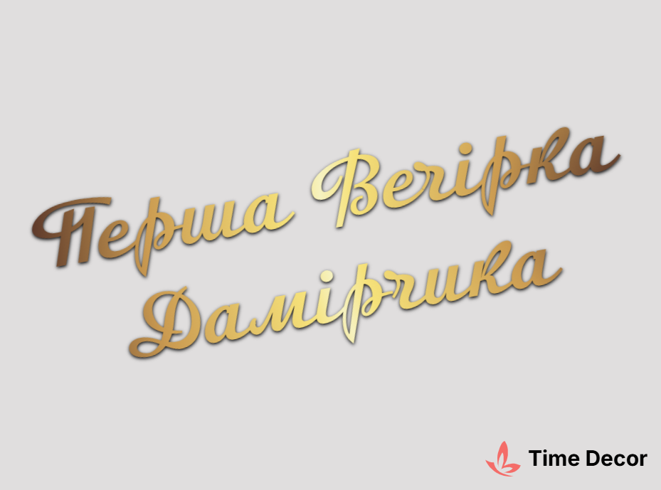 Пластиковий напис "Перша Вечірка Дамірчика" – дзеркальний або матовий пластик, можливе виготовлення з клейкою зворотною поверхнею для легкого монтажу.