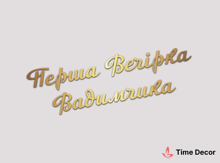 Пластиковий напис "Перша Вечірка Вадимчика" – дзеркальний або матовий пластик, можливе виготовлення з клейкою зворотною поверхнею для легкого монтажу.