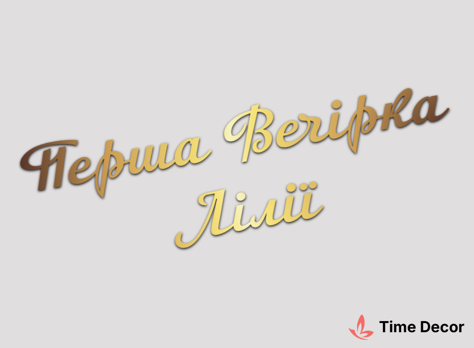 Пластиковий напис "Перша Вечірка Лілії" – дзеркальний або матовий пластик, можливе виготовлення з клейкою зворотною поверхнею для легкого монтажу.