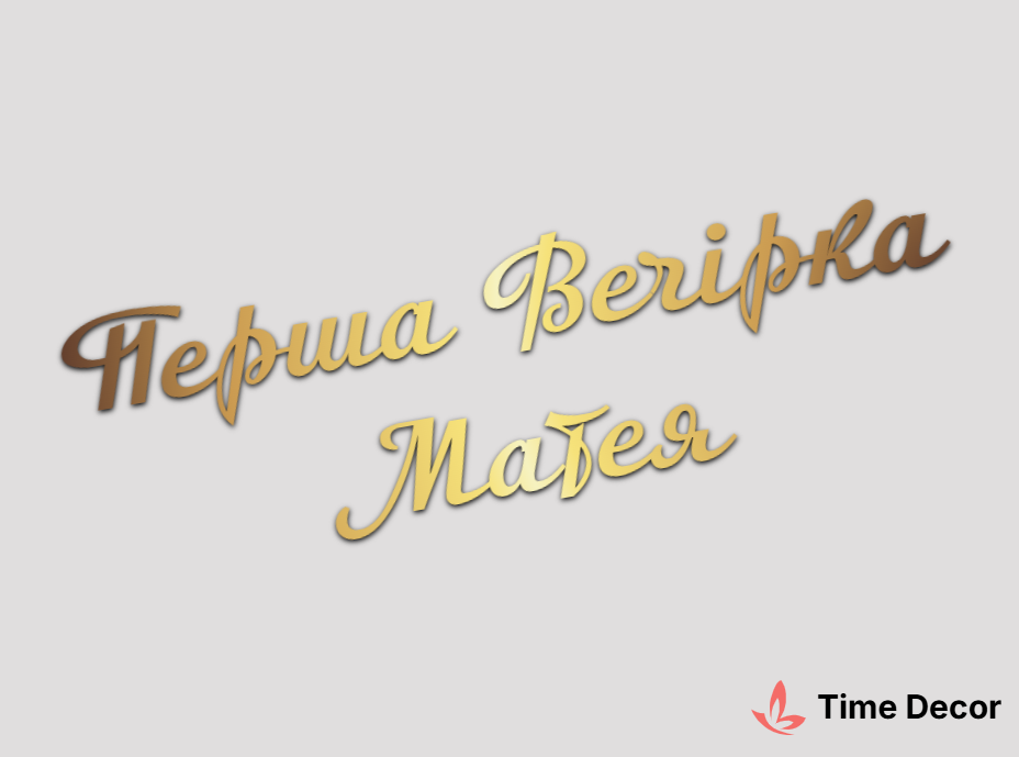 Пластиковий напис "Перша Вечірка Матея" – дзеркальний або матовий пластик, можливе виготовлення з клейкою зворотною поверхнею для легкого монтажу.