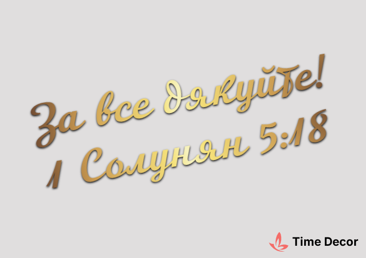 Пластиковий напис "За все дякуйте! 1 Солунян 5:18" – дзеркальний або матовий пластик, можливе виготовлення з клейкою зворотною поверхнею для легкого монтажу.