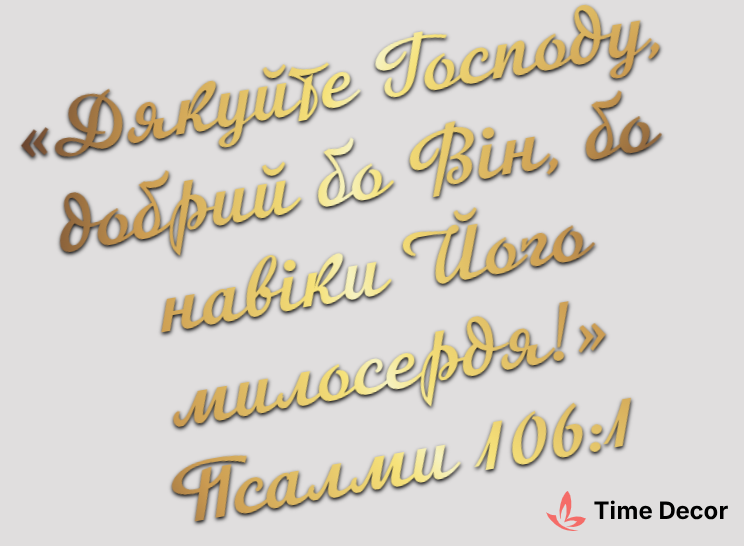 Пластиковий напис "«Дякуйте Господу, добрий бо Він, бо навіки Його милосердя!» Псалми 106:1" – дзеркальний або матовий пластик, можливе виготовлення з клейкою зворотною поверхнею для легкого монтажу.
