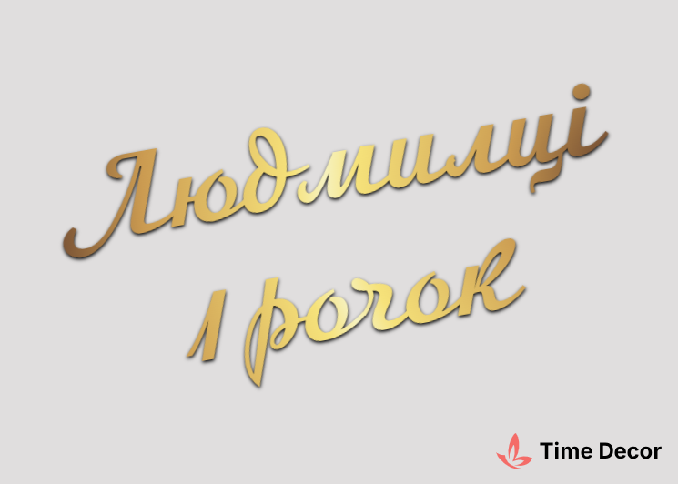 Пластиковий напис "Людмилці 1рочок" – дзеркальний або матовий пластик, можливе виготовлення з клейкою зворотною поверхнею для легкого монтажу.