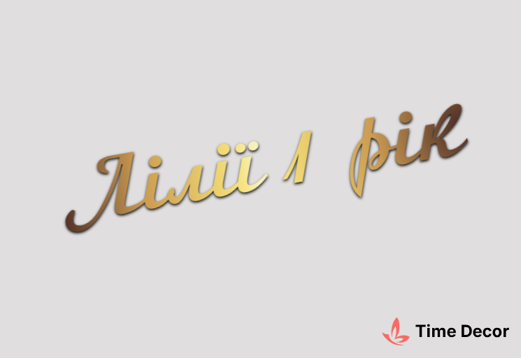 Пластиковий напис "Лілії 1 рік" – дзеркальний або матовий пластик, можливе виготовлення з клейкою зворотною поверхнею для легкого монтажу.