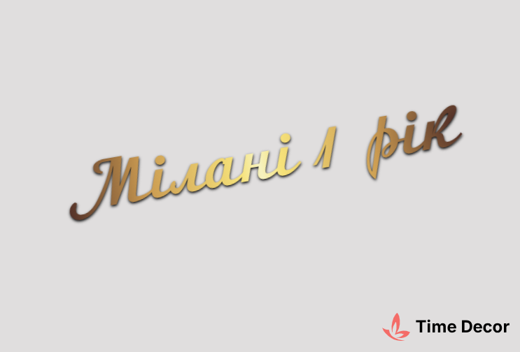 Пластиковий напис "Мілані 1 рік" – дзеркальний або матовий пластик, можливе виготовлення з клейкою зворотною поверхнею для легкого монтажу.