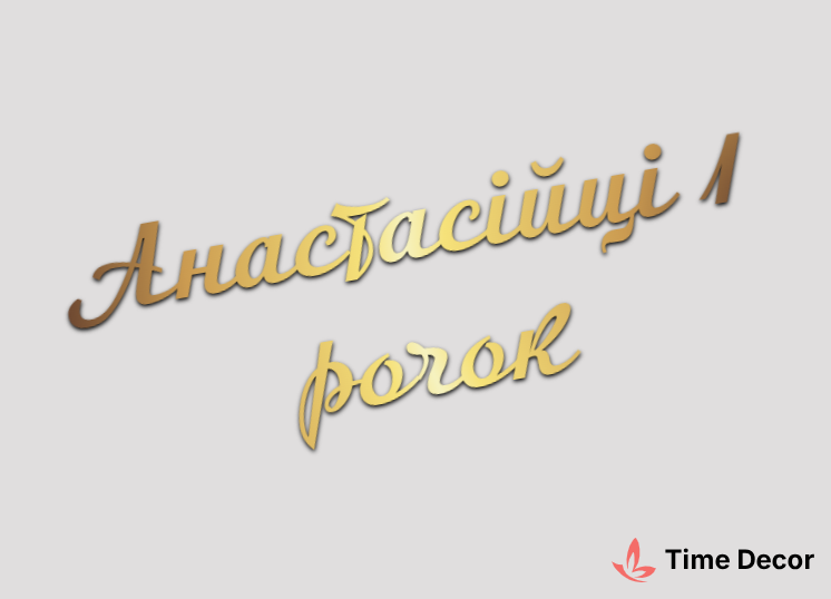 Пластиковий напис "Анастасійці 1 рочок" – дзеркальний або матовий пластик, можливе виготовлення з клейкою зворотною поверхнею для легкого монтажу.